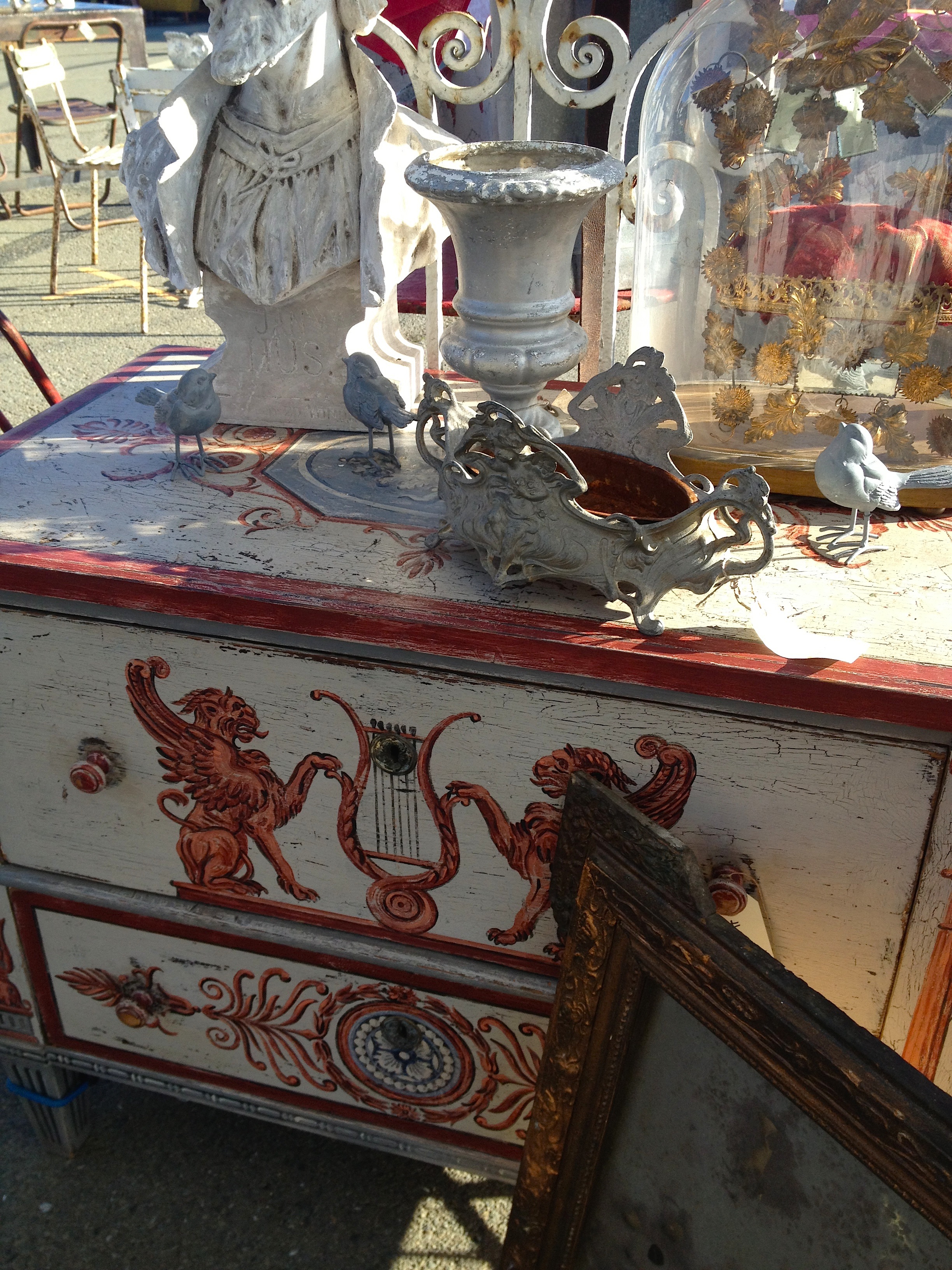 Buying wasn’t smooth. Vendors stayed true to their prices and it was hard work to get them to barter. No fun. A large wood and paper airplane was soon on my cart, along with industrial iron tape dispensers, wooden distressed shutters, an industrial iron box that will be repurposed into a cool chandelier, green painted stone urns, canvas totes, an elaborate French gesso frame, gold gilt Italian floral chandelier, old ladders, farm tools, chippy windows, turquoise cowboy boots, Victorian boxed silver, and my most unusual purchase of the day, bleached-out longhorn jawbones complete with their gnarly teeth. A must-have!